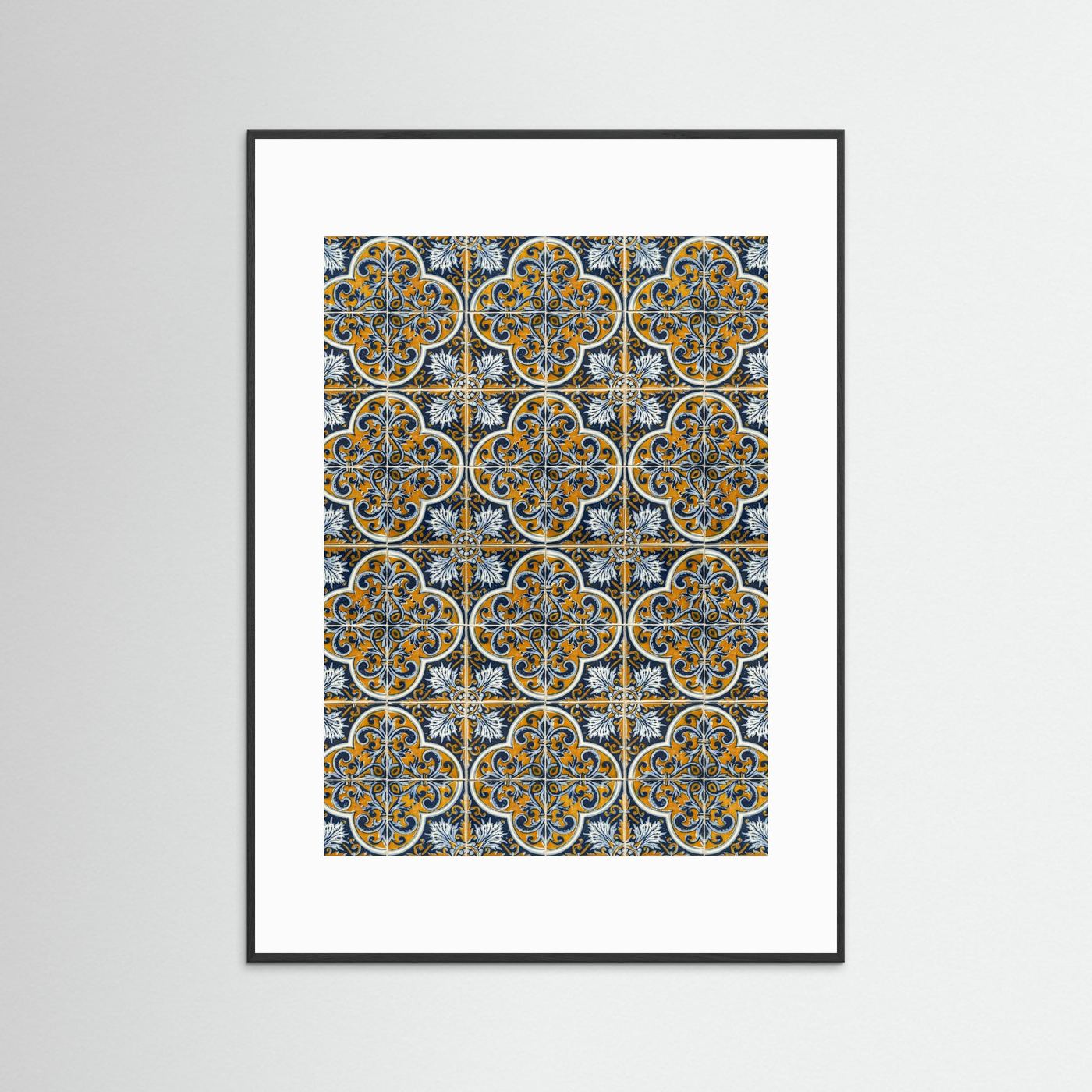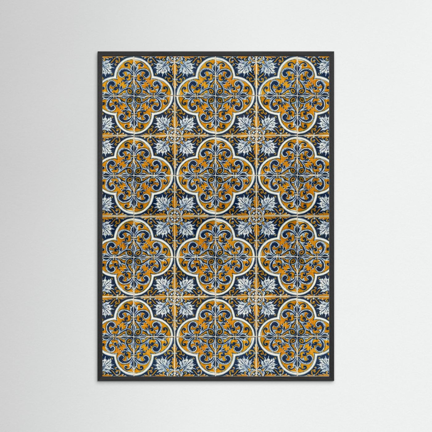 Dit beeld toont een rijk gedetailleerd blauw-oranje tegelpatroon, opgebouwd uit verfijnde florale motieven in Portugese stijl. De kleuren en symmetrie verwijzen naar de eeuwenoude azulejo-traditie die het straatbeeld en de architectuur van Portugal kenmerkt.
