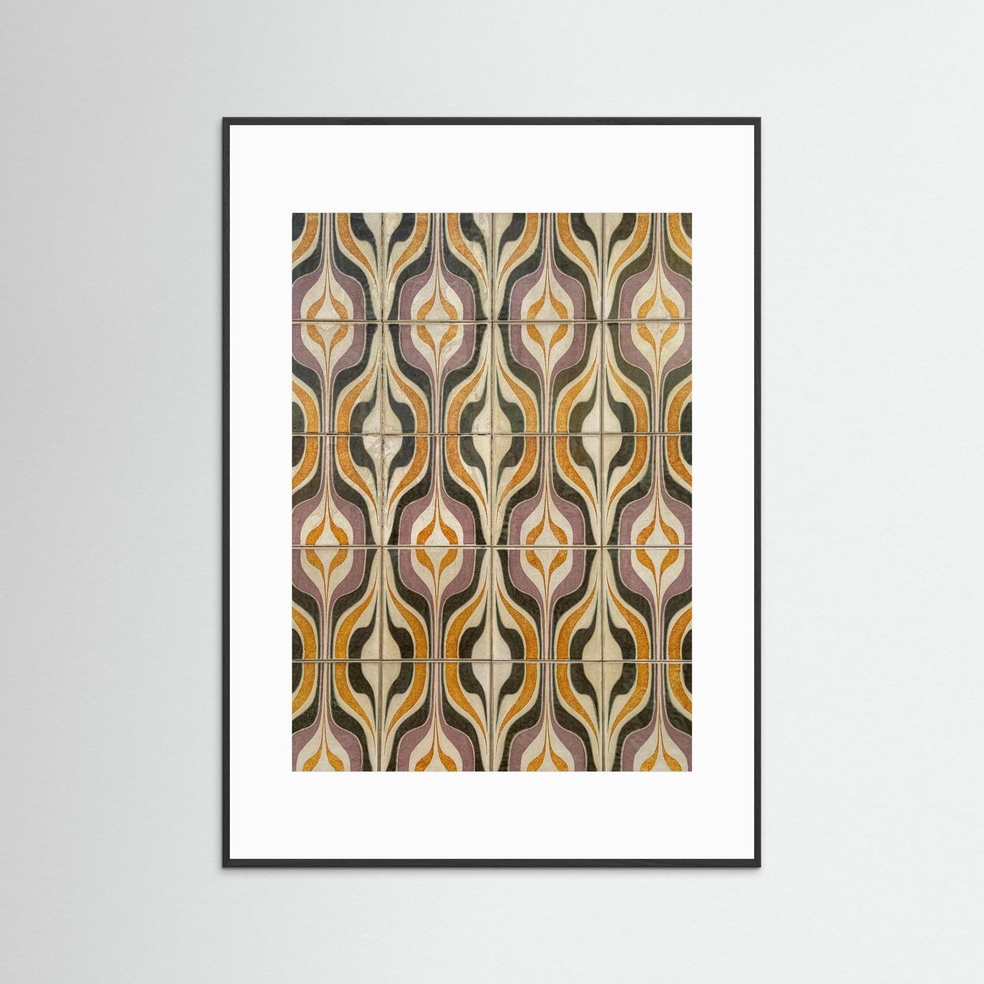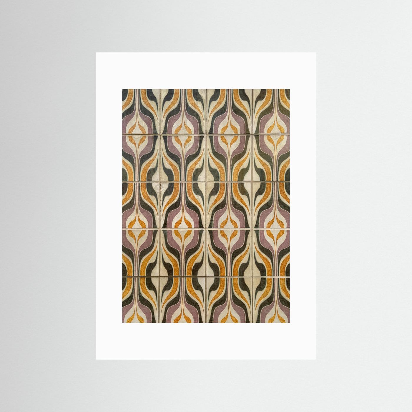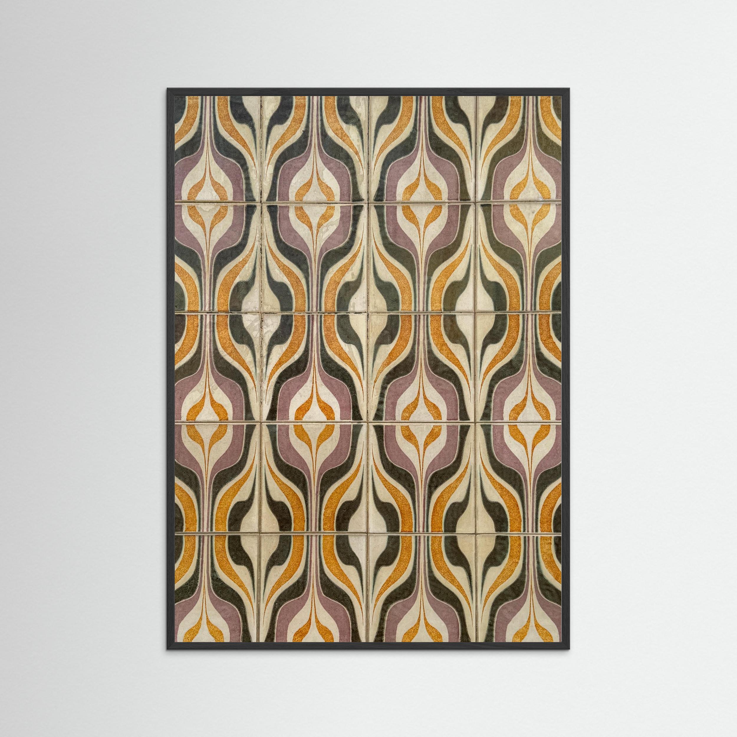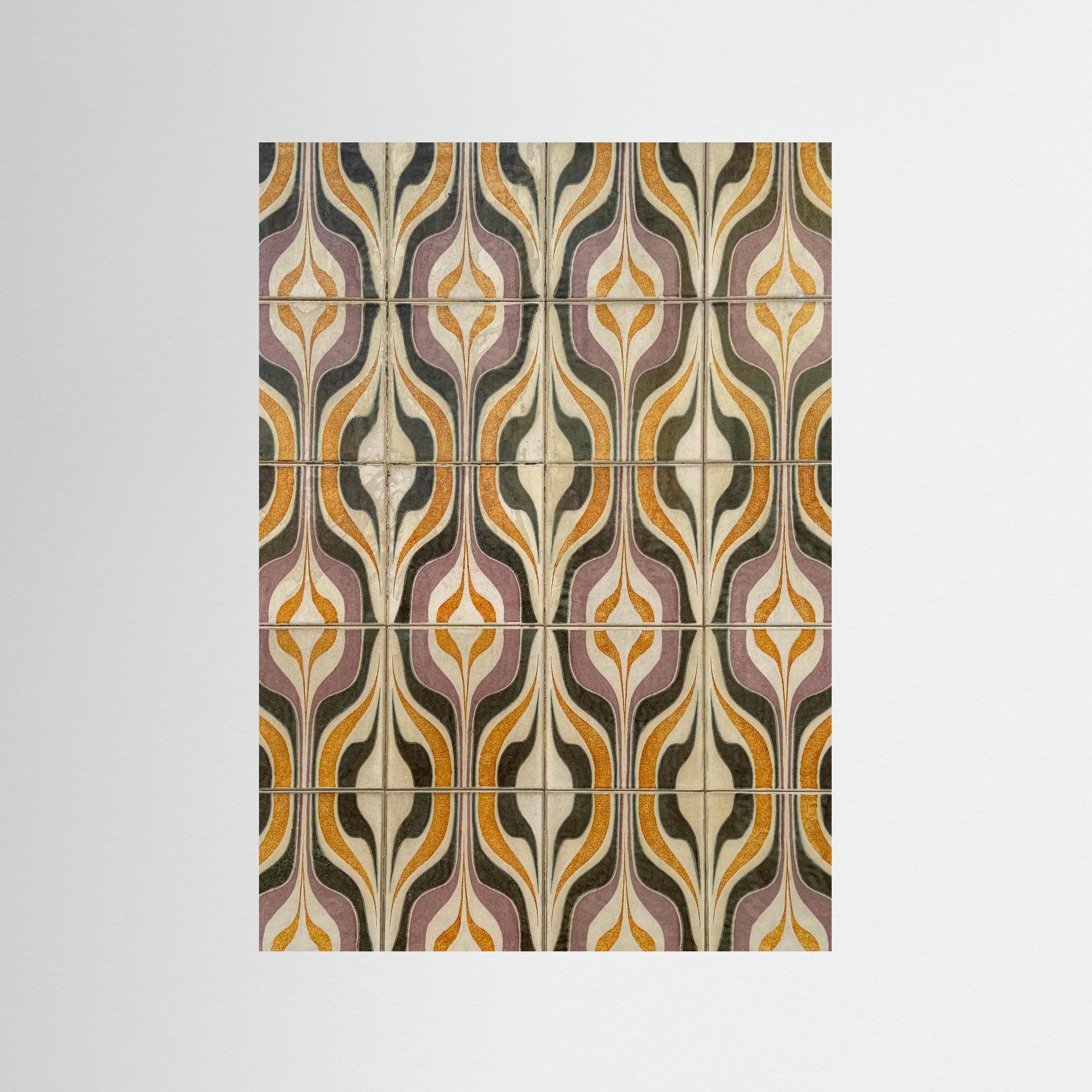 Dit beeld toont geometrische tegels uit Portugal, waar vormen en kleuren elkaar versterken in een ritmisch geheel. Oker, lavendel, olijfgroen en crème bewegen in een herhaling die tegelijk strak en speels aanvoelt.